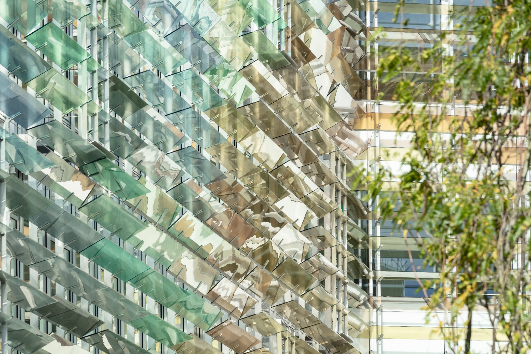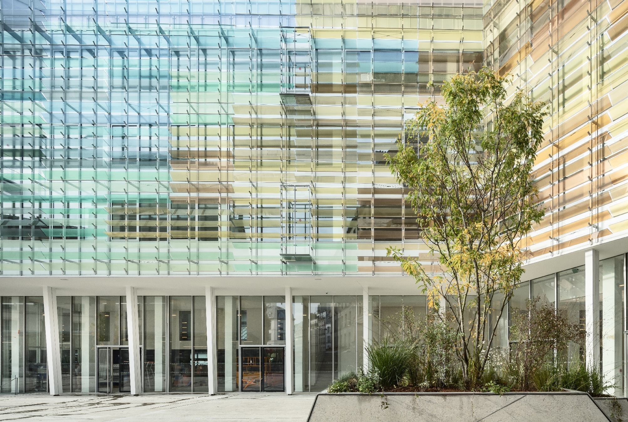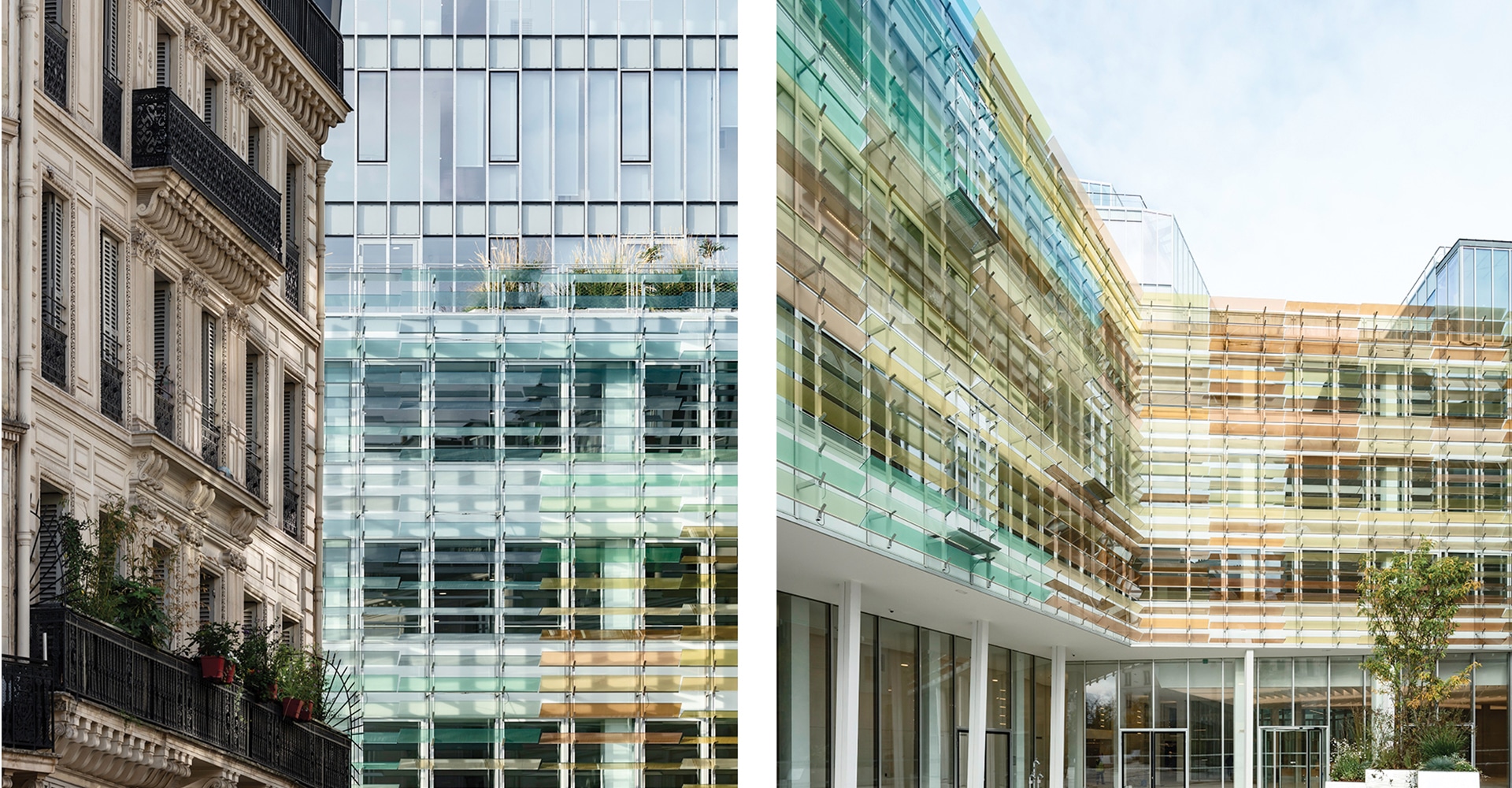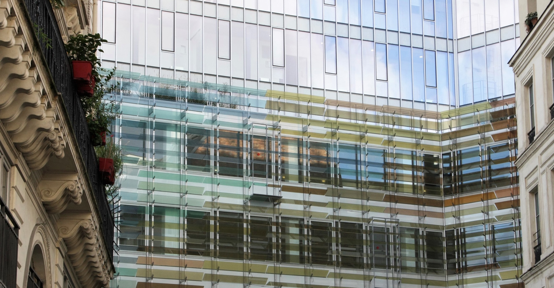Au-dessus du péristyle s’élève la façade, un voile de verre vibrant, subtilement coloré, qui joue avec la lumière du ciel et se dématérialise dans un assemblage changeant de reflets. La dominante bleue s’éclaire, au fond du passage, d’un soleil orange, hommage aux ciels impressionnistes de Claude Monet.