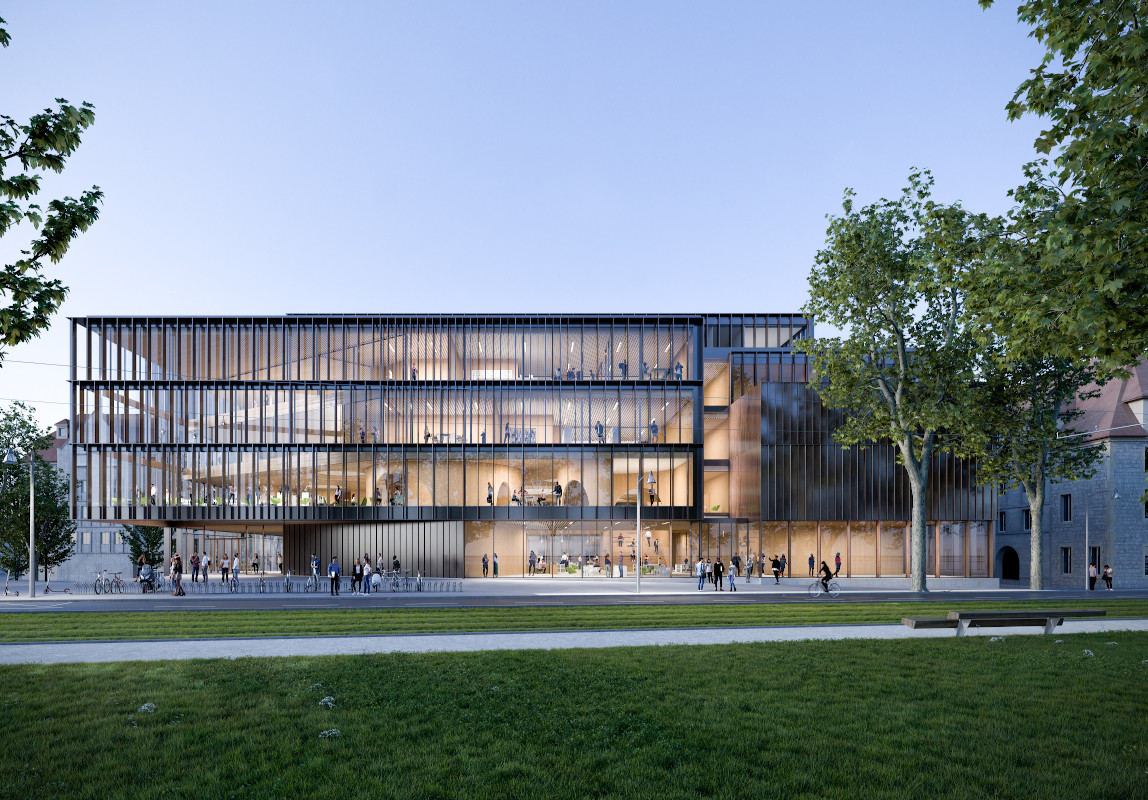Sur le plan urbain, passé et futur se combinent grâce à l’alliance subtile des matériaux, pierre, bois, verre. La grande bibliothèque se distingue comme marqueur d’un nouveau quartier, innovant, contemporain, en accord avec l’environnement patrimonial et emblématique du site de l’ancien hôpital Saint-Jacques.