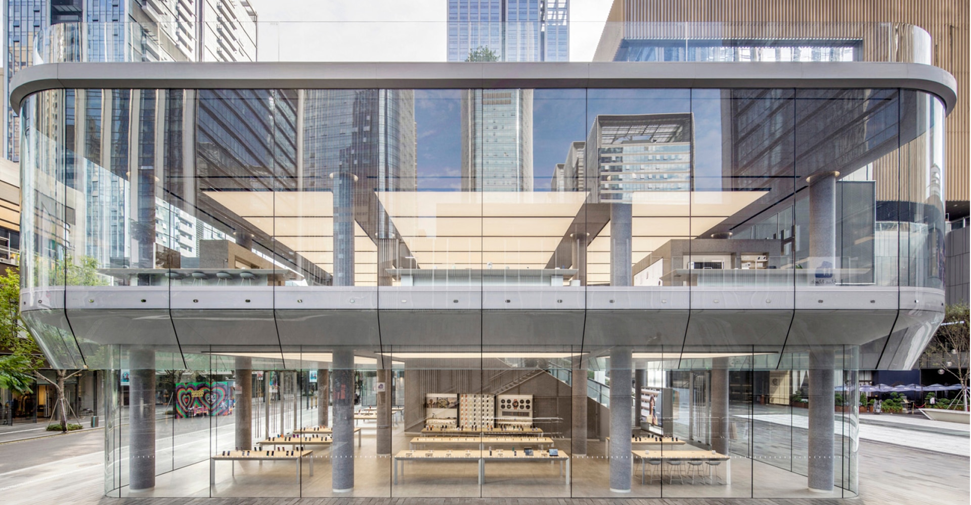 L’ambition du cabinet d’architecture d’intérieur n’était pas de créer un magasin, mais une « architecture relationnelle » déclinée sur 1 300 m² et trois étages. Le lieu évoque un cocon transparent grâce à l’utilisation de techniques de pointe comme le verre courbé, parfois en trois dimensions, qui apporte une atmosphère enveloppante.