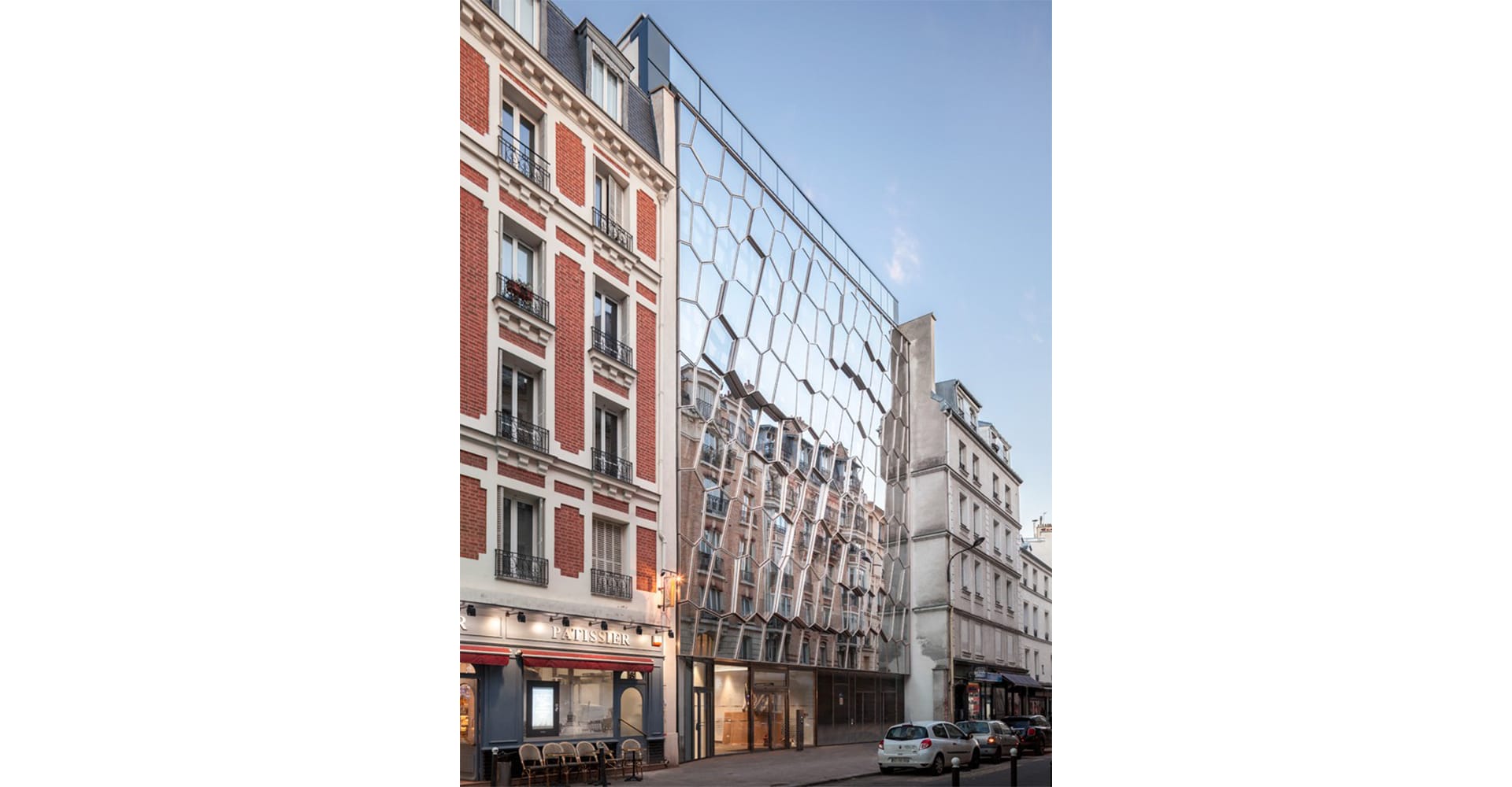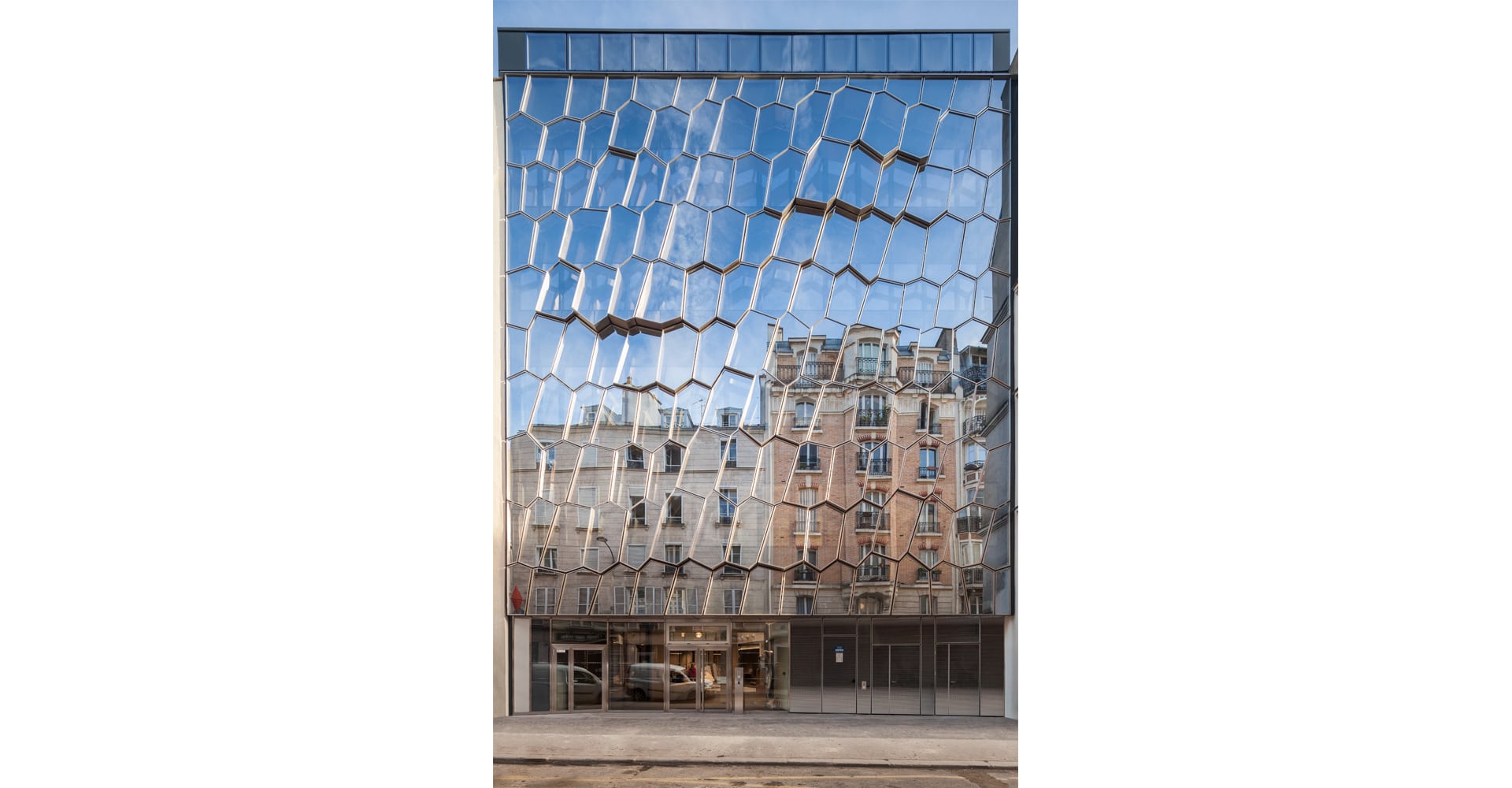 La façade facettée aux allures organiques reflète Paris et rappelle la dimension scientifique de ce qu’elle protège.
