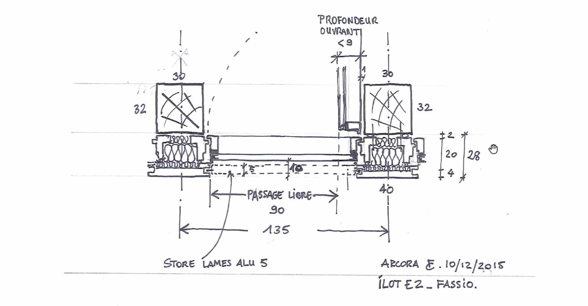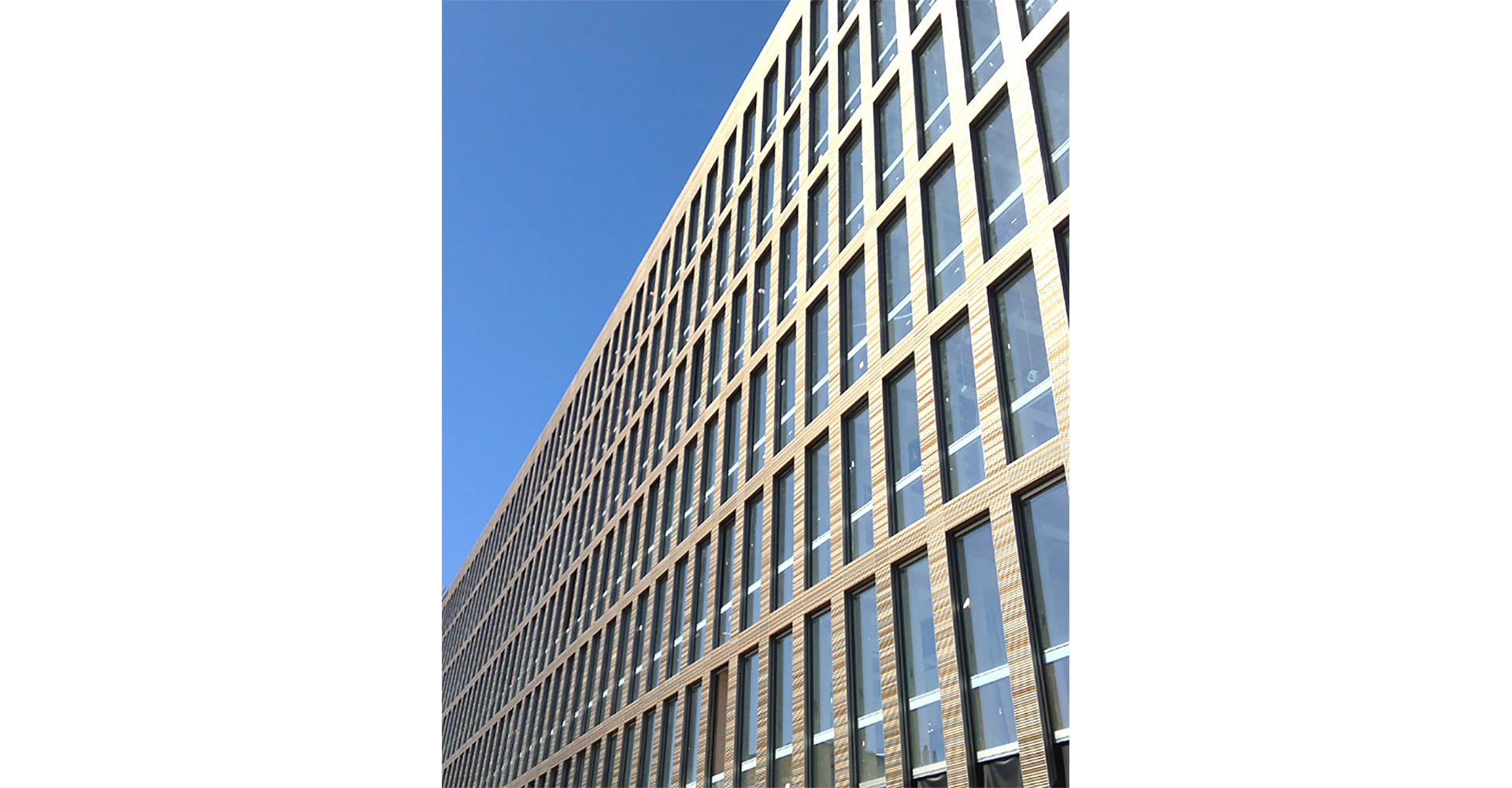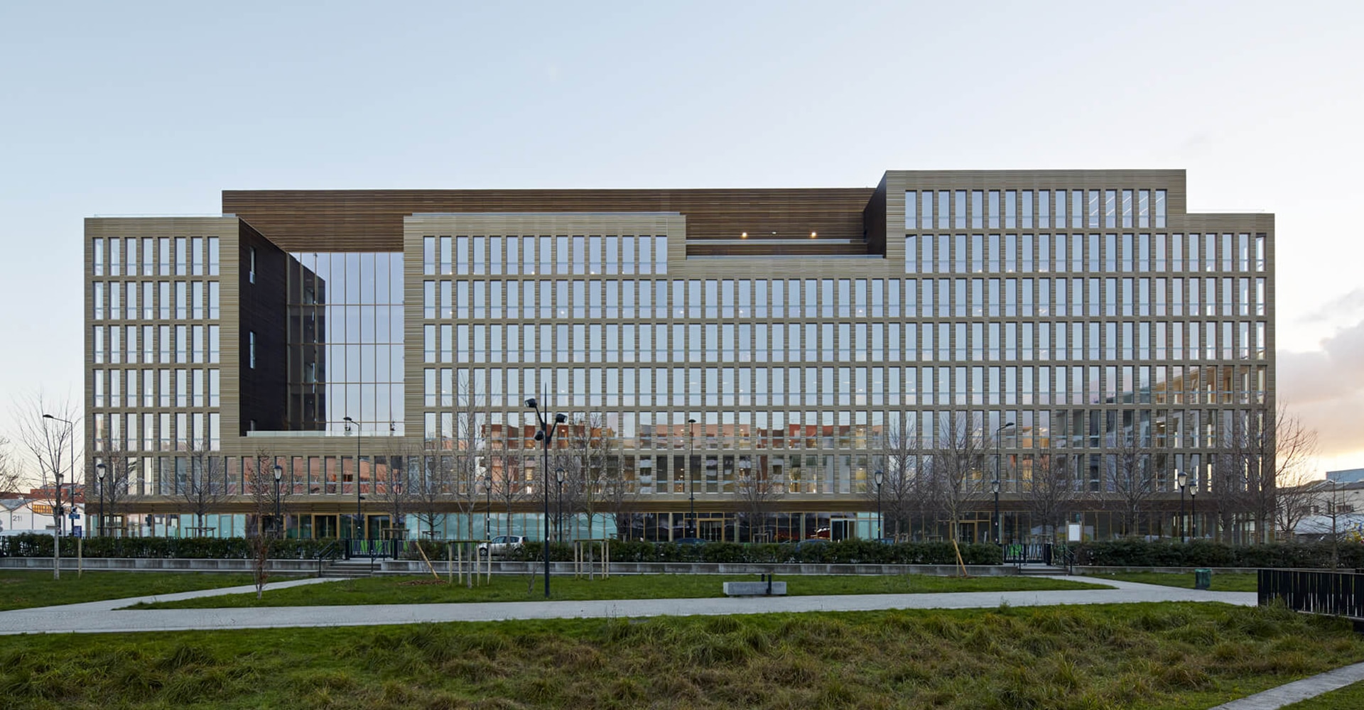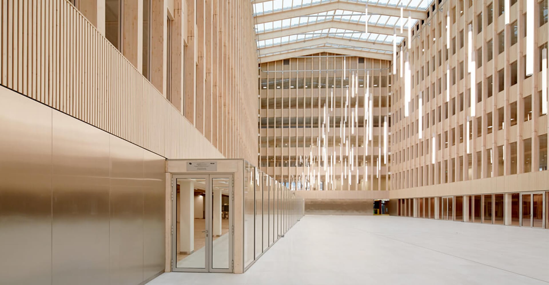 L’immeuble s’organise autour d’un large atrium, véritable nef couverte d’une verrière où se révèle la présence du bois. En façade, la géométrie et la répétition systématique des larges baies forment une mosaïque qui s’interrompt au-dessus du hall d’entrée et révèle de grands espaces végétalisés, ouverts entre la ville et l’atrium. La structure mixte bois-béton impose une rigueur constructive qui se pare d’une gangue de lames d’aluminium dont les trois nuances miroitent au soleil.