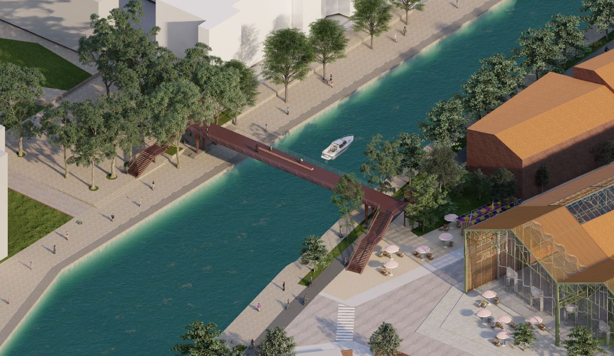 Dans ce contexte, une passerelle de franchissement du canal de l’Ourcq sera construite. Cette passerelle permettra notamment aux usagers des bureaux d’avoir un accès direct vers leur lieu de travail depuis la station de métro Église de Pantin (ligne 5). La structure sera élégante et légère et permettra de s’inscrire en toute sobriété dans le paysage environnant.