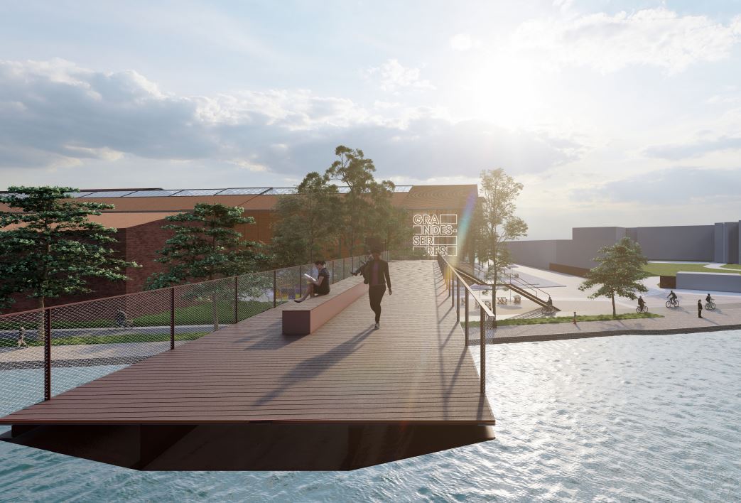 La passerelle de franchissement du canal de l’Ourcq fait partie d’un projet plus large de reconversion d’une friche industrielle et de création d’un ensemble immobilier mixant communauté tertiaire, acteurs culturels, restaurants, services partagés et commerces.