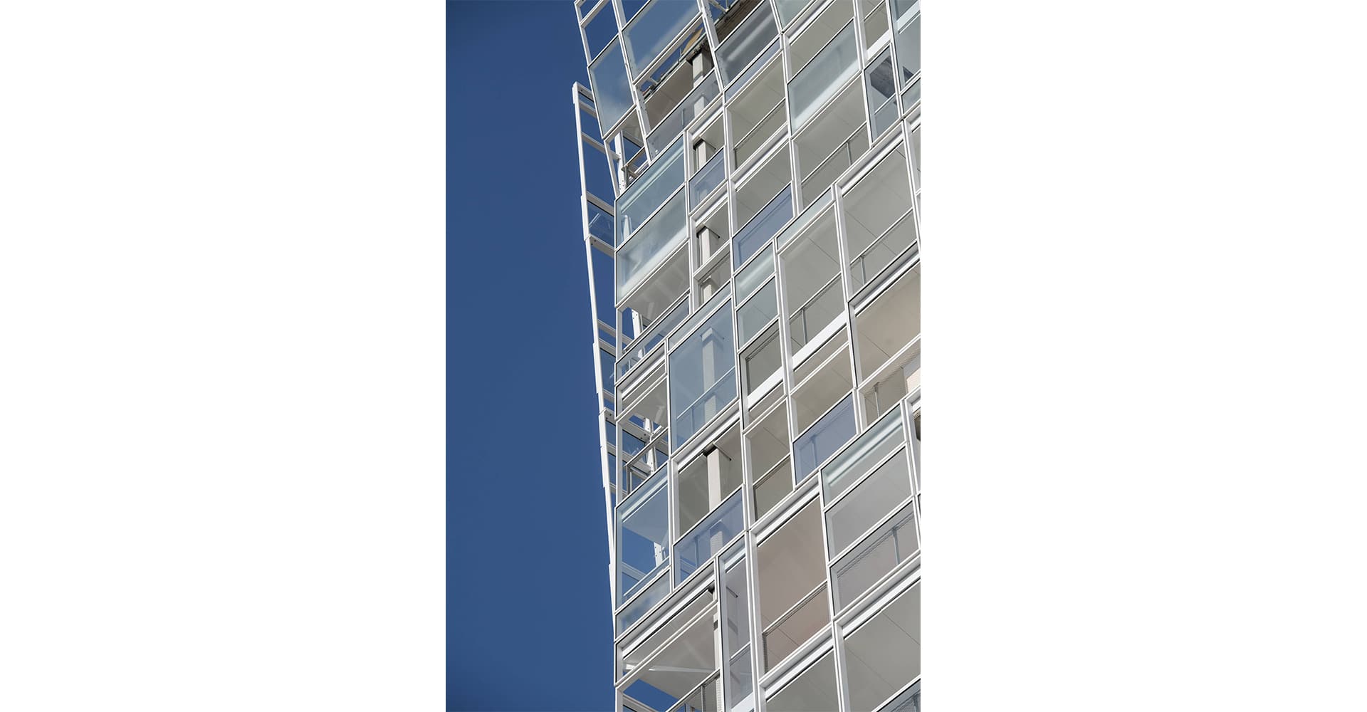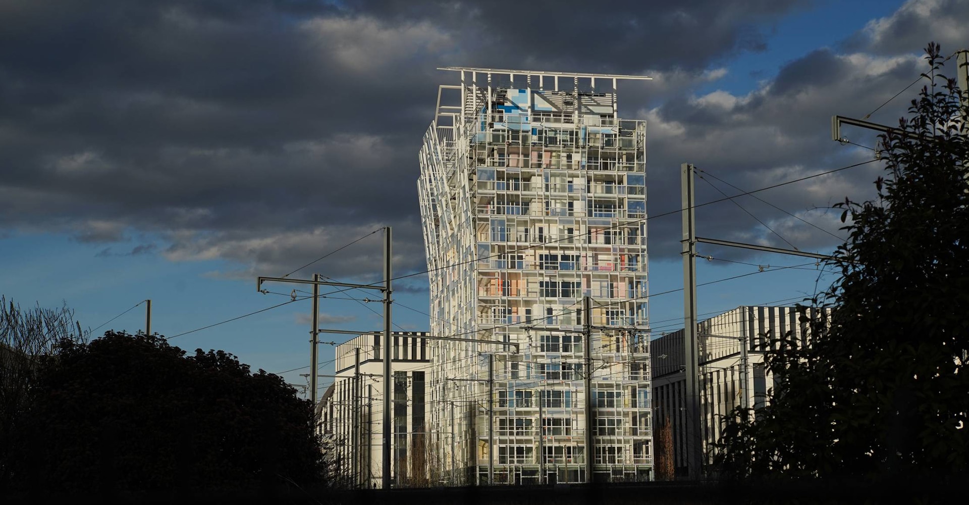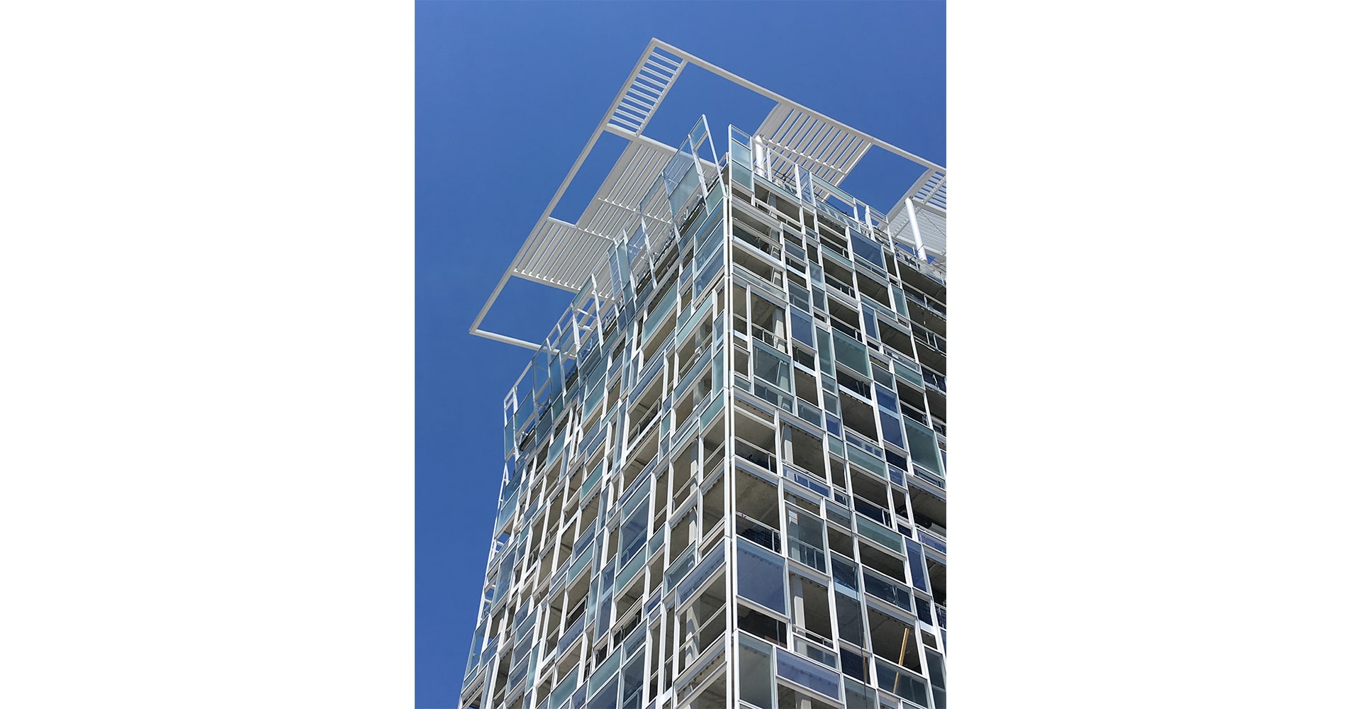 Ycone atteint 64 mètres de hauteur avec une ossature bois, des façades de béton habillées d’aluminium et doublées d’une peau en verre opaline qui ménage, pour tous les appartements, de spacieuses terrasses ou loggias « où l’on est à la fois dehors et dedans », précise l’architecte. L’ensemble est coiffé d’une gracieuse ombrière de métal, indispensable l’été, à Lyon.