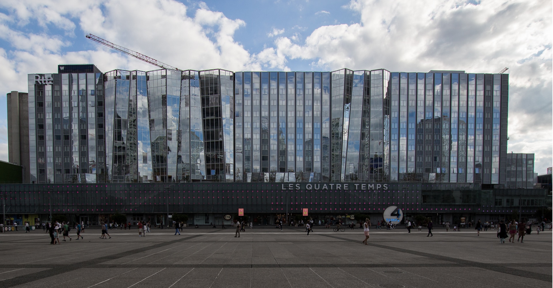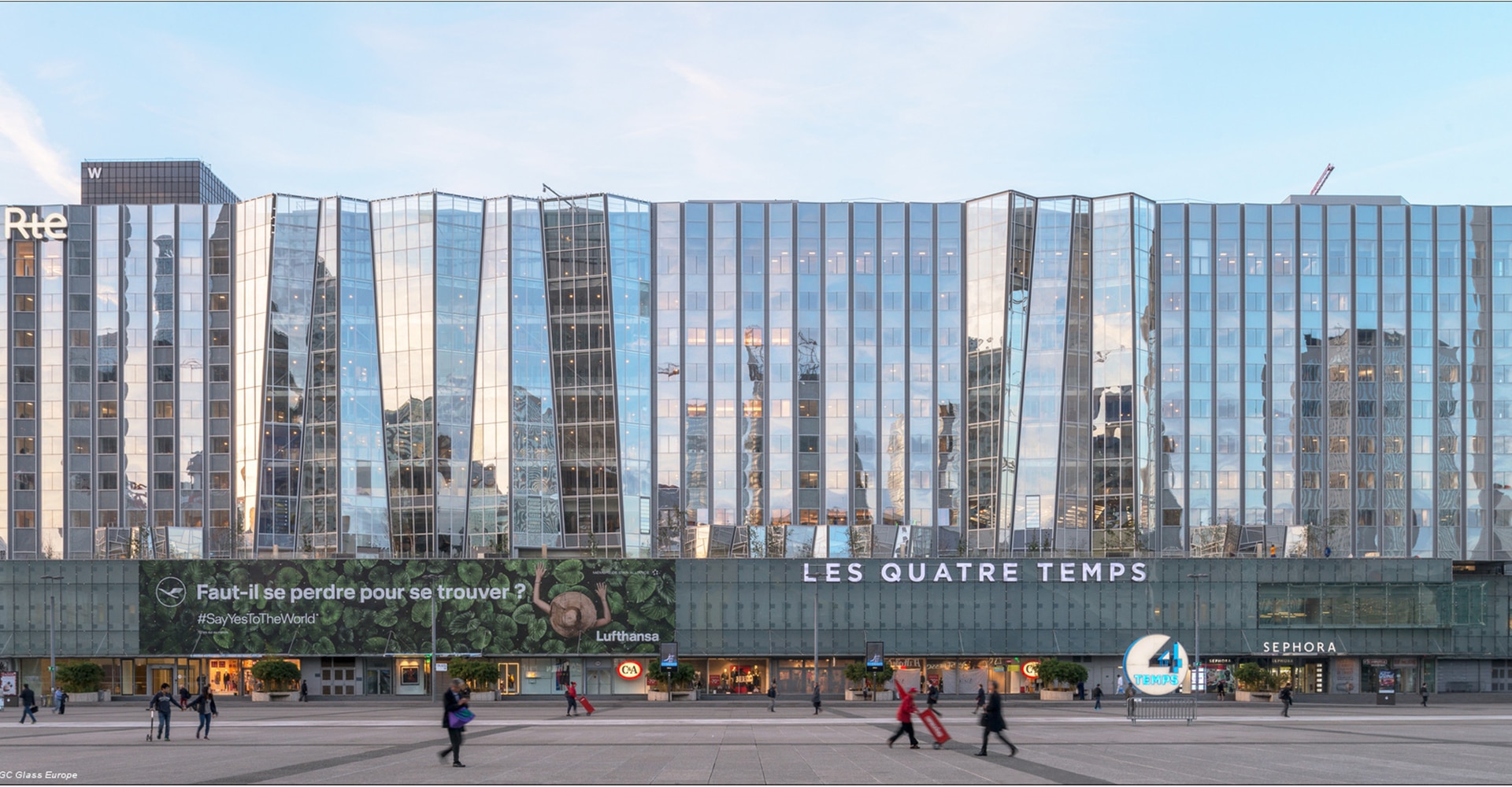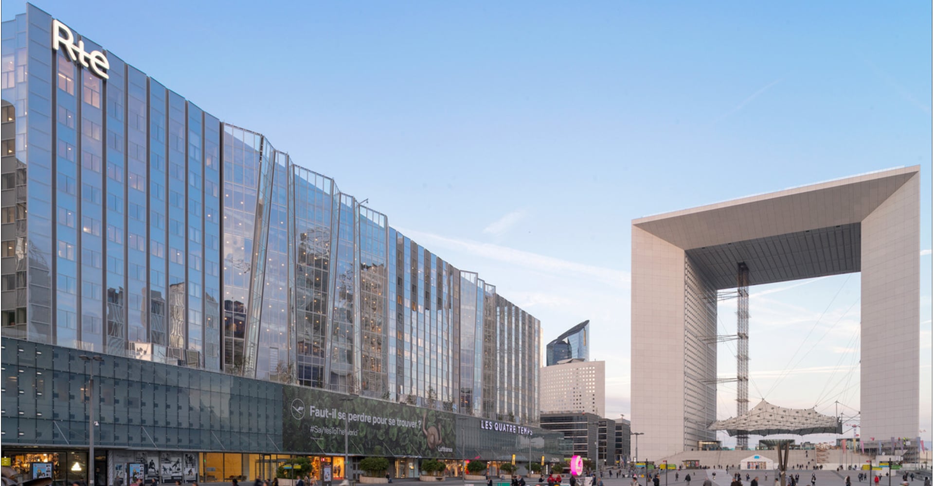 L’objectif de cette façade plissée surplombant le centre commercial des Quatre Temps, tel un rideau de théâtre, est de faire échos au modernisme de l’architecture de la Grande Arche et du CNIT. Toute en transparence, elle apporte légèreté au bâtiment.